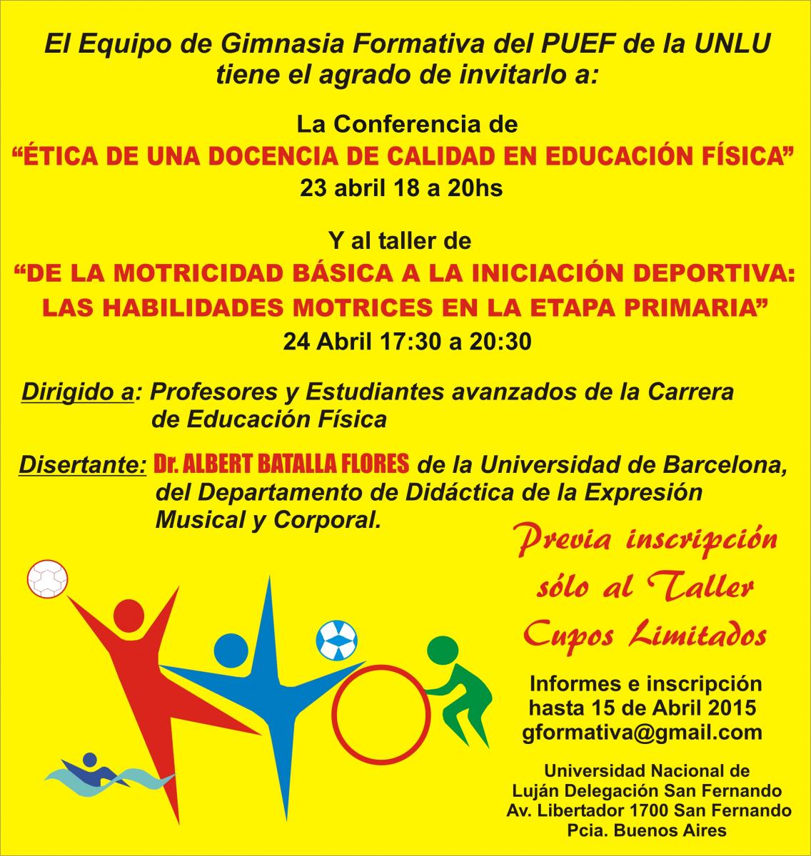 Ambas actividades están dirigidas a profesores y estudiantes avanzados de la Carrera de Educación Física y contarán como disertante al doctor Albert Batalla Flores, del Departamento de Didáctica de la Expresión Musical y Corporal de la Universidad de Barcelona. Pueden solicitarse informes al correo electrónico gformativa@gmail.com.